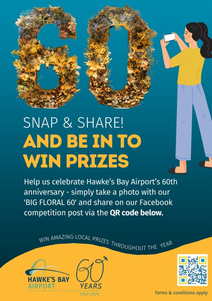 Let’s make this year extra special as we celebrate 60 amazing years. A super-sized ‘60’ sign representing the flora and fauna of Hawke’s Bay has been installed in the terminal foyer and we would love you to snap a photo in front of the ‘Big floral 60’, sharing the joy with us. We have some amazing local prizes to give away throughout the year, and we will be drawing a different prize each month from the those who have commented on the Facebook post with their photo.