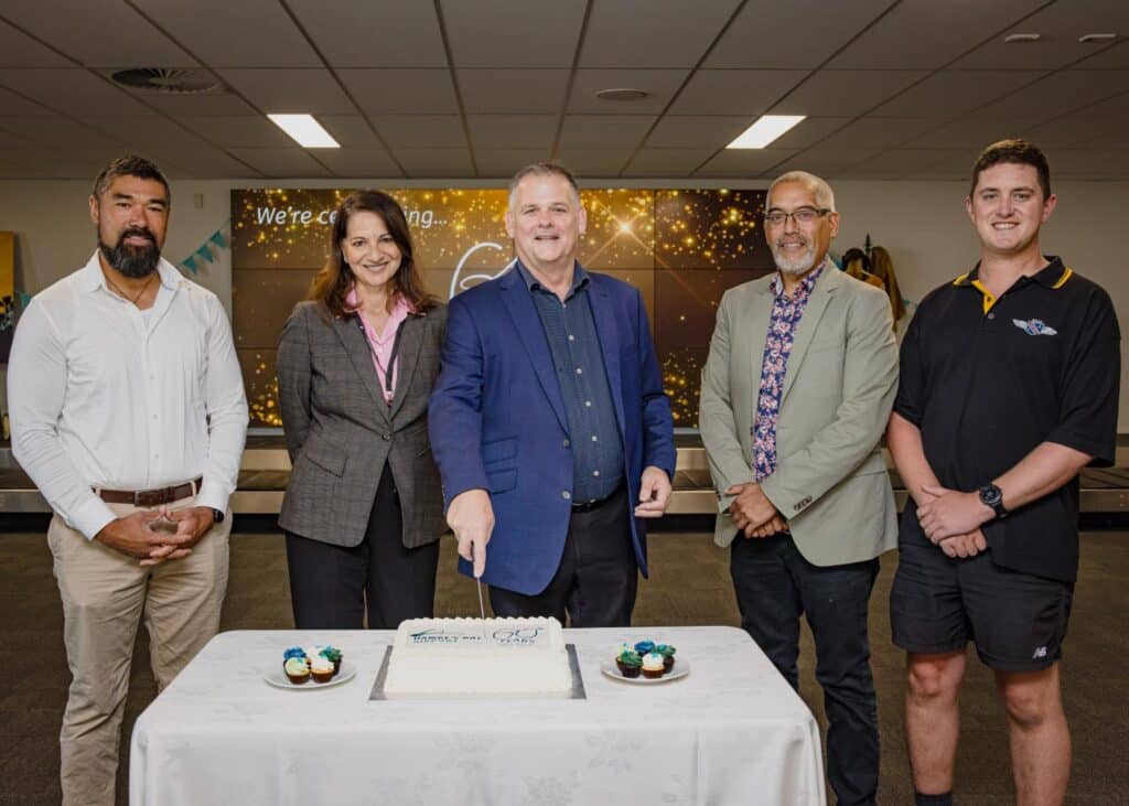 The airport’s sixtieth anniversary celebrations kicked off yesterday with the cutting of a special 60th anniversary cake and commemorative photo in the terminal with shareholders, tenants and key community and business partners. Also unveiled was a new historical timeline on the mezzanine floor that tells some of the unique stories of the airport from 1931. A super-sized ‘60’ sign representing the flora and fauna of Hawke’s Bay is being installed at the terminal entrance as an ‘insta’ worthy installation for travellers, customers, and visitors. There will be other special activities and celebrations throughout the year including a new kids’ play area, with festivities culminating with the much loved ‘run the runway’ event.